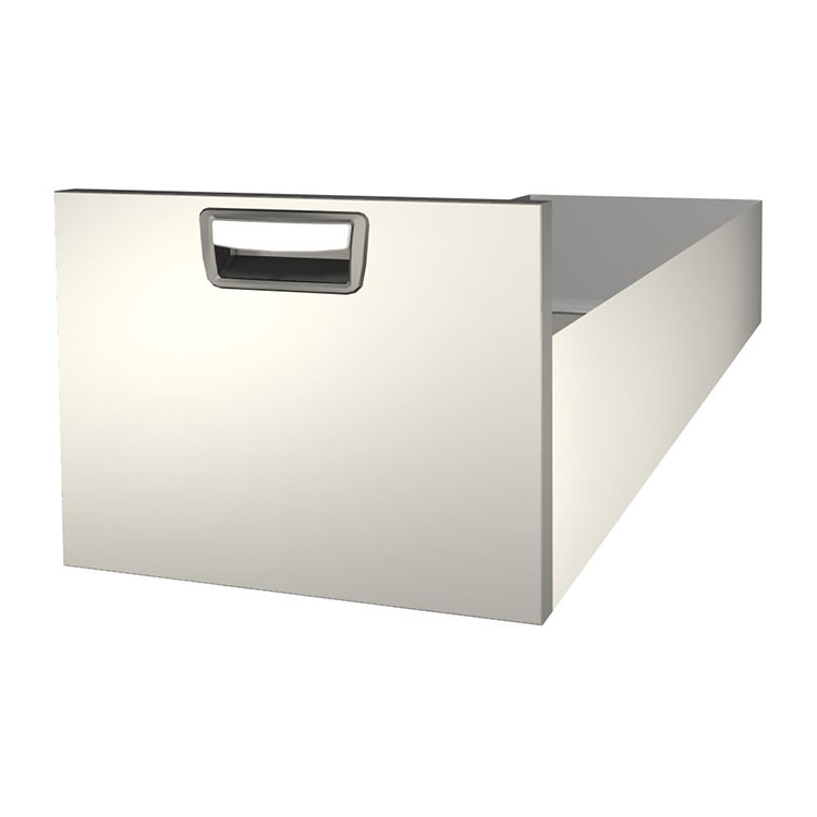 Robusto cajón extralargo para el montaje en un marco de cajonera. El cajón, fabricado en aluminio, tiene cojinetes de bolas de serie y la mezcla de cojinetes fijos y flexibles hace que el cajón sea estable y fácil de manejar.