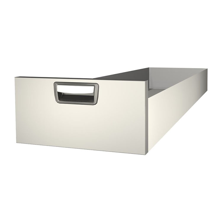 Robusto cajón extralargo para el montaje en un marco de cajonera. El cajón, fabricado en aluminio, tiene cojinetes de bolas de serie y la mezcla de cojinetes fijos y flexibles hace que el cajón sea estable y fácil de manejar.