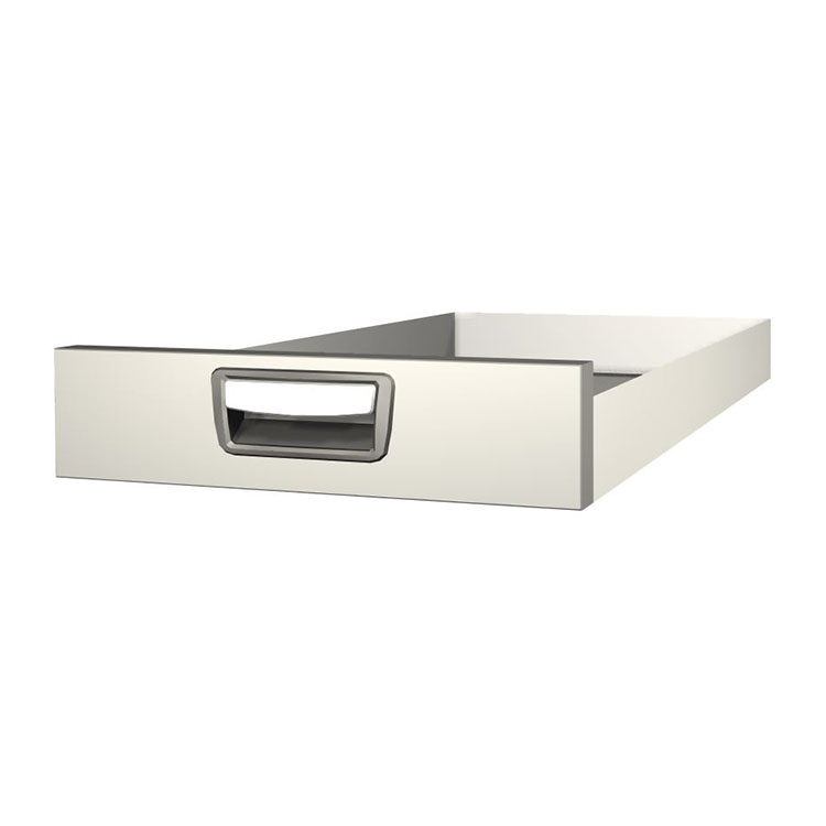 Robusto cajón extralargo para el montaje en un marco de cajonera. El cajón, fabricado en aluminio, tiene cojinetes de bolas de serie y la mezcla de cojinetes fijos y flexibles hace que el cajón sea estable y fácil de manejar.