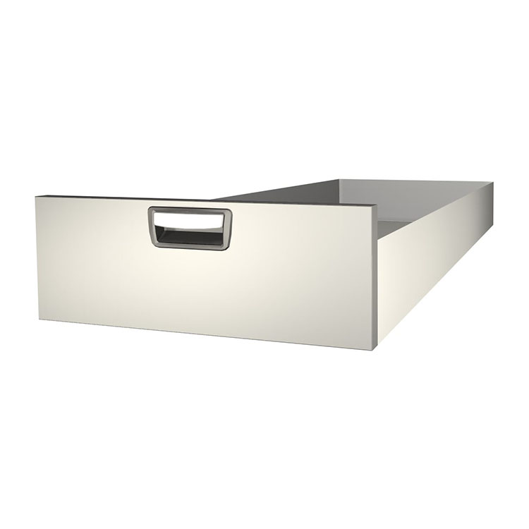 Robusto cajón extralargo para el montaje en un marco de cajonera. El cajón, fabricado en aluminio, tiene cojinetes de bolas de serie y la mezcla de cojinetes fijos y flexibles hace que el cajón sea estable y fácil de manejar.