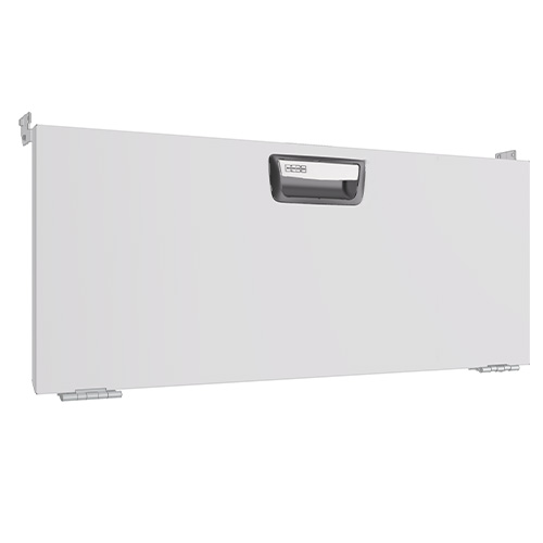 Drop down doors are fitted with gas springs on both sides that ensure smooth opening and closing. The opening angle is 90 degrees. The door pull has a built-in catch that prevents it from opening while the vehicle is in motion. The door is also suitable for wheel arch frames fitted with bench tops. When fitting doors between two shelf end supports, a mounting frame must be used.