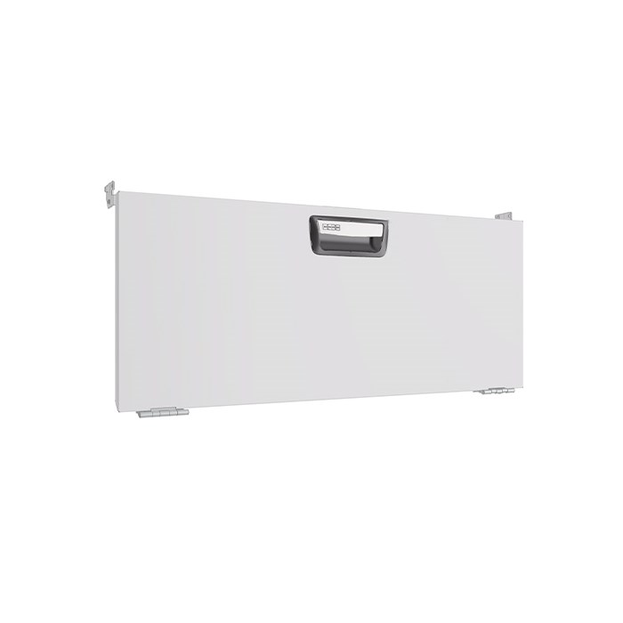 Drop down doors are fitted with gas springs on both sides that ensure smooth opening and closing. The opening angle is 90 degrees. The door pull has a built-in catch that prevents it from opening while the vehicle is in motion. The door is also suitable for wheel arch frames fitted with bench tops. When fitting doors between two shelf end supports, a mounting frame must be used.