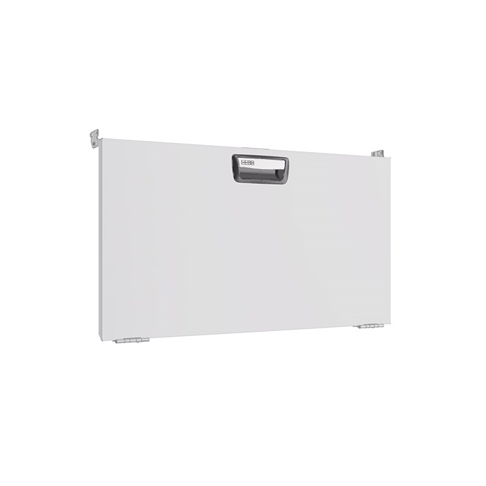 Drop down doors are fitted with gas springs on both sides that ensure smooth opening and closing. The opening angle is 90 degrees. The door pull has a built-in catch that prevents it from opening while the vehicle is in motion. The door is also suitable for wheel arch frames fitted with bench tops. When fitting doors between two shelf end supports, a mounting frame must be used.