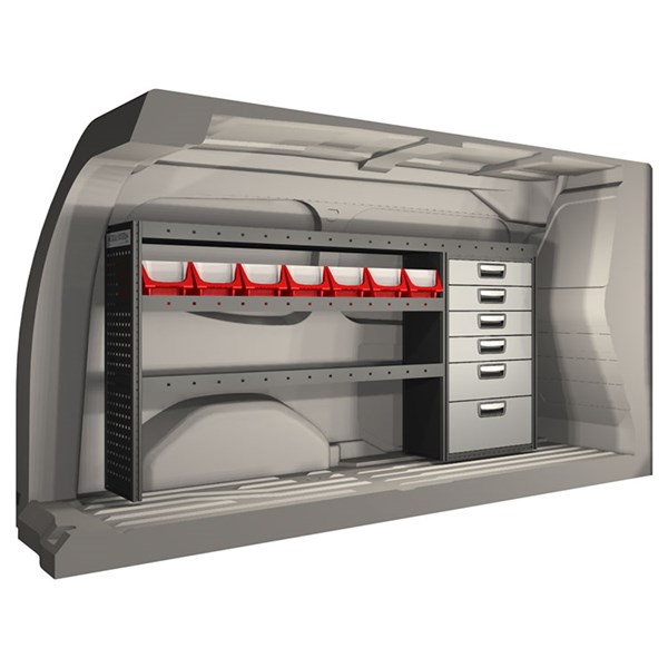 El equipamiento ha sido especialmente diseñado para garantizar el ajuste óptimo para el vehículo, así como la mayor funcionalidad y seguridad posible. Se ha desarrollado para uso profesional, es versátil y está destinado para trabajos de servicio en diversos tipos de negocio. Todas las estanterías están equipadas con alfombrillas de goma, y todos los cajones con alfombrillas de espuma de plástico. Los accesorios de montaje están incluidos.