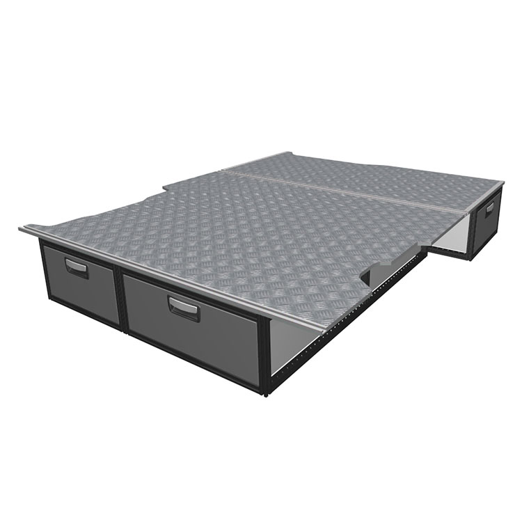 The kit is designed to be fitted on top of a Modul-Floor, utilizing the floor rails for a non-intrusive installation. The double floor is equipped with rails for easy installation of vehicle racking, and edging strips for a nice finish.