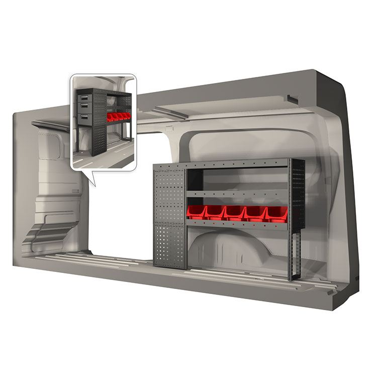 The racking has been specially designed to ensure the optimum fit to the vehicle, as well as the best possible functionality and safety. It has been developed for professional use, is flexible and is intended for service jobs in various types of business. All shelves are equipped with rubber mats, and all drawers with foam plastic liners. Assembly material is included.