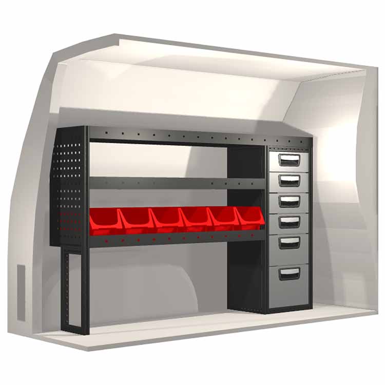 El equipamiento ha sido especialmente diseñado para garantizar el ajuste óptimo para el vehículo, así como la mayor funcionalidad y seguridad posible. Se ha desarrollado para uso profesional, es versátil y está destinado para trabajos de servicio en diversos tipos de negocio. Todas las estanterías están equipadas con alfombrillas de goma, y todos los cajones con alfombrillas de espuma de plástico. Los accesorios de montaje están incluidos.
