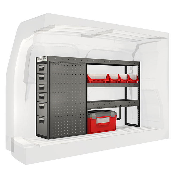 El equipamiento ha sido especialmente diseñado para garantizar el ajuste óptimo para el vehículo, así como la mayor funcionalidad y seguridad posible. Se ha desarrollado para uso profesional, es versátil y está destinado para trabajos de servicio en diversos tipos de negocio. Todas las estanterías están equipadas con alfombrillas de goma, y todos los cajones con alfombrillas de espuma de plástico. Los accesorios de montaje están incluidos.