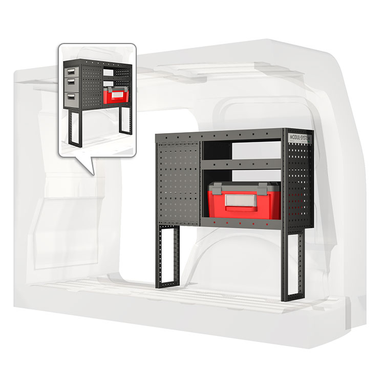 El equipamiento ha sido especialmente diseñado para garantizar el ajuste óptimo para el vehículo, así como la mayor funcionalidad y seguridad posible. Se ha desarrollado para uso profesional, es versátil y está destinado para trabajos de servicio en diversos tipos de negocio. Todas las estanterías están equipadas con alfombrillas de goma, y todos los cajones con alfombrillas de espuma de plástico. Los accesorios de montaje están incluidos.