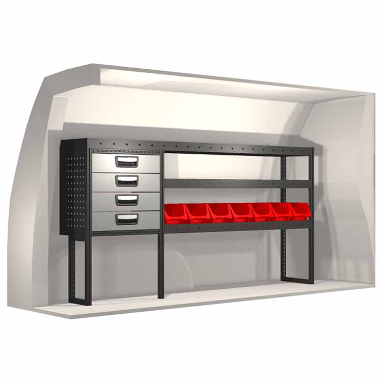 El equipamiento ha sido especialmente diseñado para garantizar el ajuste óptimo para el vehículo, así como la mayor funcionalidad y seguridad posible. Se ha desarrollado para uso profesional, es versátil y está destinado para trabajos de servicio en diversos tipos de negocio. Todas las estanterías están equipadas con alfombrillas de goma, y todos los cajones con alfombrillas de espuma de plástico. Los accesorios de montaje están incluidos.