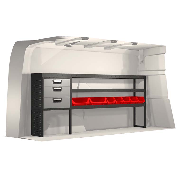 El equipamiento ha sido especialmente diseñado para garantizar el ajuste óptimo para el vehículo, así como la mayor funcionalidad y seguridad posible. Se ha desarrollado para uso profesional, es versátil y está destinado para trabajos de servicio en diversos tipos de negocio. Todas las estanterías están equipadas con alfombrillas de goma, y todos los cajones con alfombrillas de espuma de plástico. Los accesorios de montaje están incluidos.