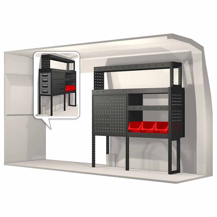 El equipamiento ha sido especialmente diseñado para garantizar el ajuste óptimo para el vehículo, así como la mayor funcionalidad y seguridad posible. Se ha desarrollado para uso profesional, es versátil y está destinado para trabajos de servicio en diversos tipos de negocio. Todas las estanterías están equipadas con alfombrillas de goma, y todos los cajones con alfombrillas de espuma de plástico. Los accesorios de montaje están incluidos.