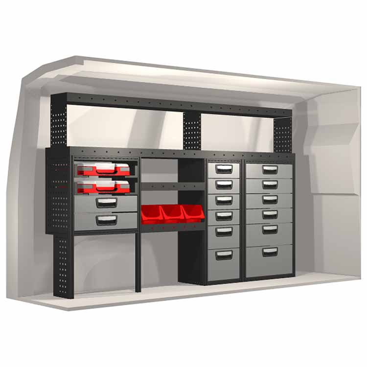 El equipamiento ha sido especialmente diseñado para garantizar el ajuste óptimo para el vehículo, así como la mayor funcionalidad y seguridad posible. Se ha desarrollado para uso profesional, es versátil y está destinado para trabajos de servicio en diversos tipos de negocio. Todas las estanterías están equipadas con alfombrillas de goma, y todos los cajones con alfombrillas de espuma de plástico. Los accesorios de montaje están incluidos.