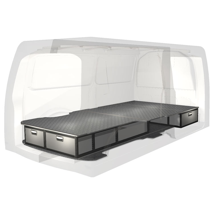 The kit is designed to be fitted on top of a Modul-Floor, utilizing the floor rails for a non-intrusive installation. The double floor is equipped with rails for easy installation of vehicle racking, and edging strips for a nice finish.