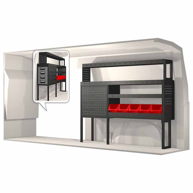 El equipamiento ha sido especialmente diseñado para garantizar el ajuste óptimo para el vehículo, así como la mayor funcionalidad y seguridad posible. Se ha desarrollado para uso profesional, es versátil y está destinado para trabajos de servicio en diversos tipos de negocio. Todas las estanterías están equipadas con alfombrillas de goma, y todos los cajones con alfombrillas de espuma de plástico. Los accesorios de montaje están incluidos.