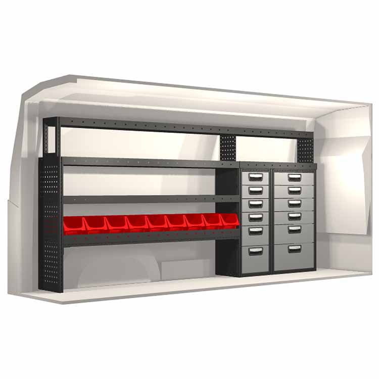 El equipamiento ha sido especialmente diseñado para garantizar el ajuste óptimo para el vehículo, así como la mayor funcionalidad y seguridad posible. Se ha desarrollado para uso profesional, es versátil y está destinado para trabajos de servicio en diversos tipos de negocio. Todas las estanterías están equipadas con alfombrillas de goma, y todos los cajones con alfombrillas de espuma de plástico. Los accesorios de montaje están incluidos.
