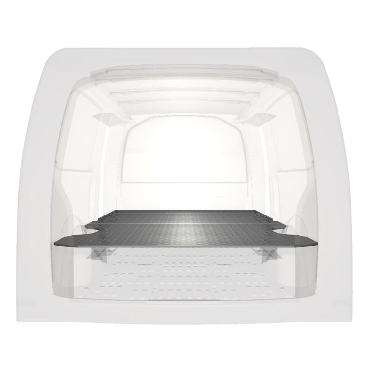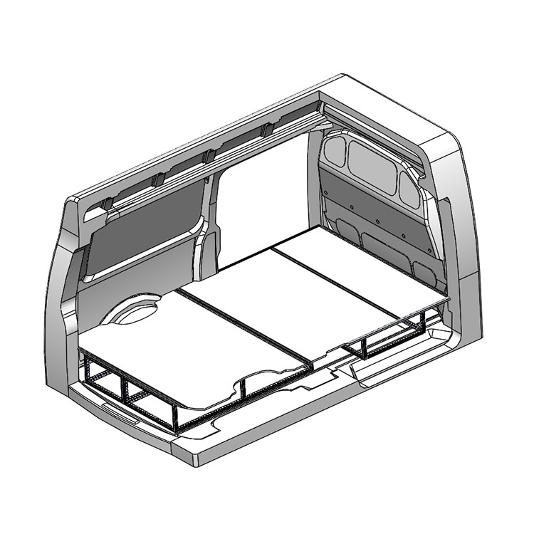 Double floor for a Volkswagen Transporter 2016- L2 without heater. The floor is designed to fit an extra-long drawer solution with one drawer unit 486x1458x270 and one 648x1458x270 coming out from the rear doors, and one drawer unit 648x1458x270 coming out from the side door.